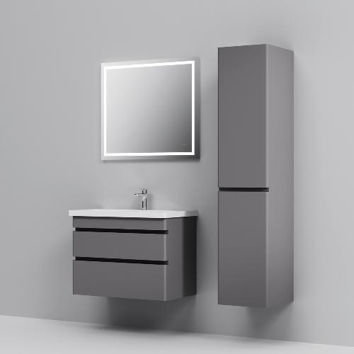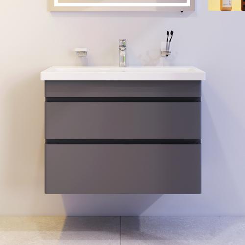 Новинка меблі для ванної Hit. Фасади в кольорі графіт покриті екологічно чистими і довговічними поліакриловими емалями, які наносяться за спеціальною технологією фарбування в 7 шарів. Це забезпечує насичений колір протягом усього терміну служби (від 10 років). М'яке відкриття і закриття ящиків забезпечують напрямні прихованого монтажу з системою м'якого закривання soft close. Тумба комплектується раковиною з склоподібного фарфору, самого гігієнічного і вологостійкого матеріалу. Це найкомпактніша і функціональна раковина на ринку: проекція всього 42 см при максимальній глибині чаші!
