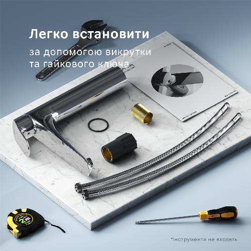Високий вилив надає змішувачу витончений вигляд і ідеально підійде для раковини з глибокої чашею, а завдяки широкій зоні руху ручки управляти температурою води ще простіше.