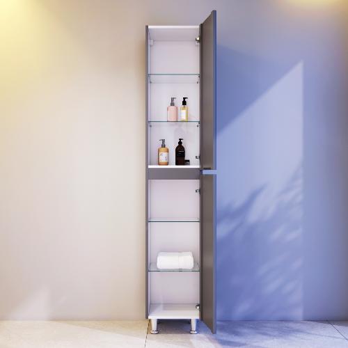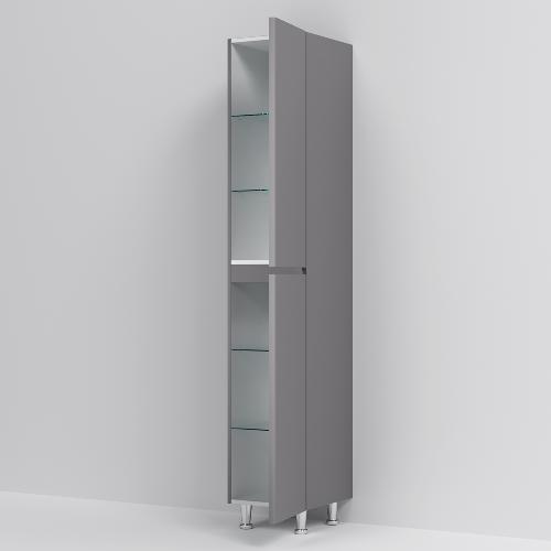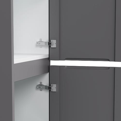 Новинка мебель для ванной Hit. Фасады в цвете графит покрыты экологически чистыми и долговечными полиакриловыми эмалями, которые наносятся по специальной технологии покраски в 7 слоев. Это обеспечивает насыщенный цвет в течение всего срока службы (от 10 лет). Мягкое открытие и закрытие дверей обеспечивают петли с доводчиками. Внутри установлены полки из стекла.